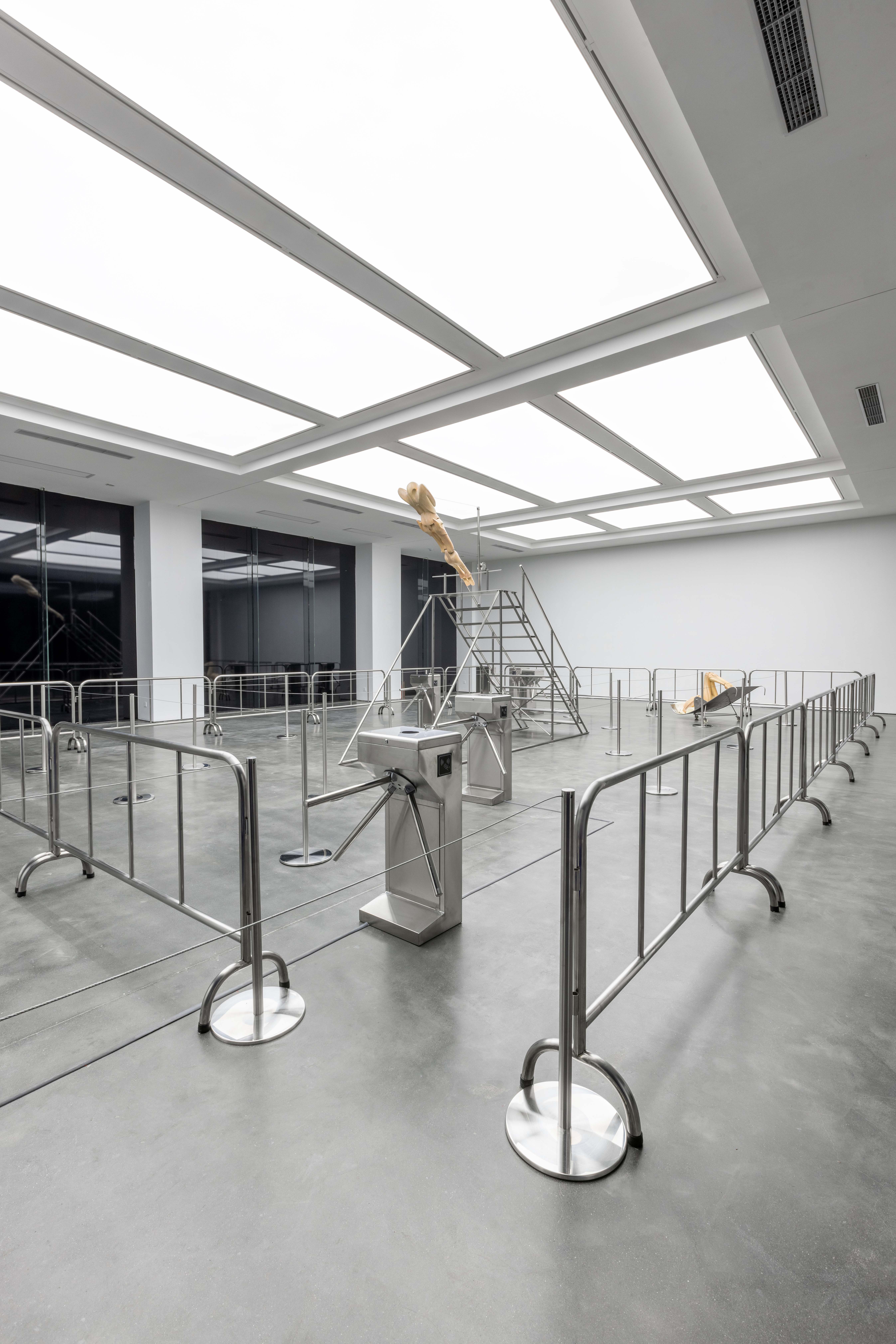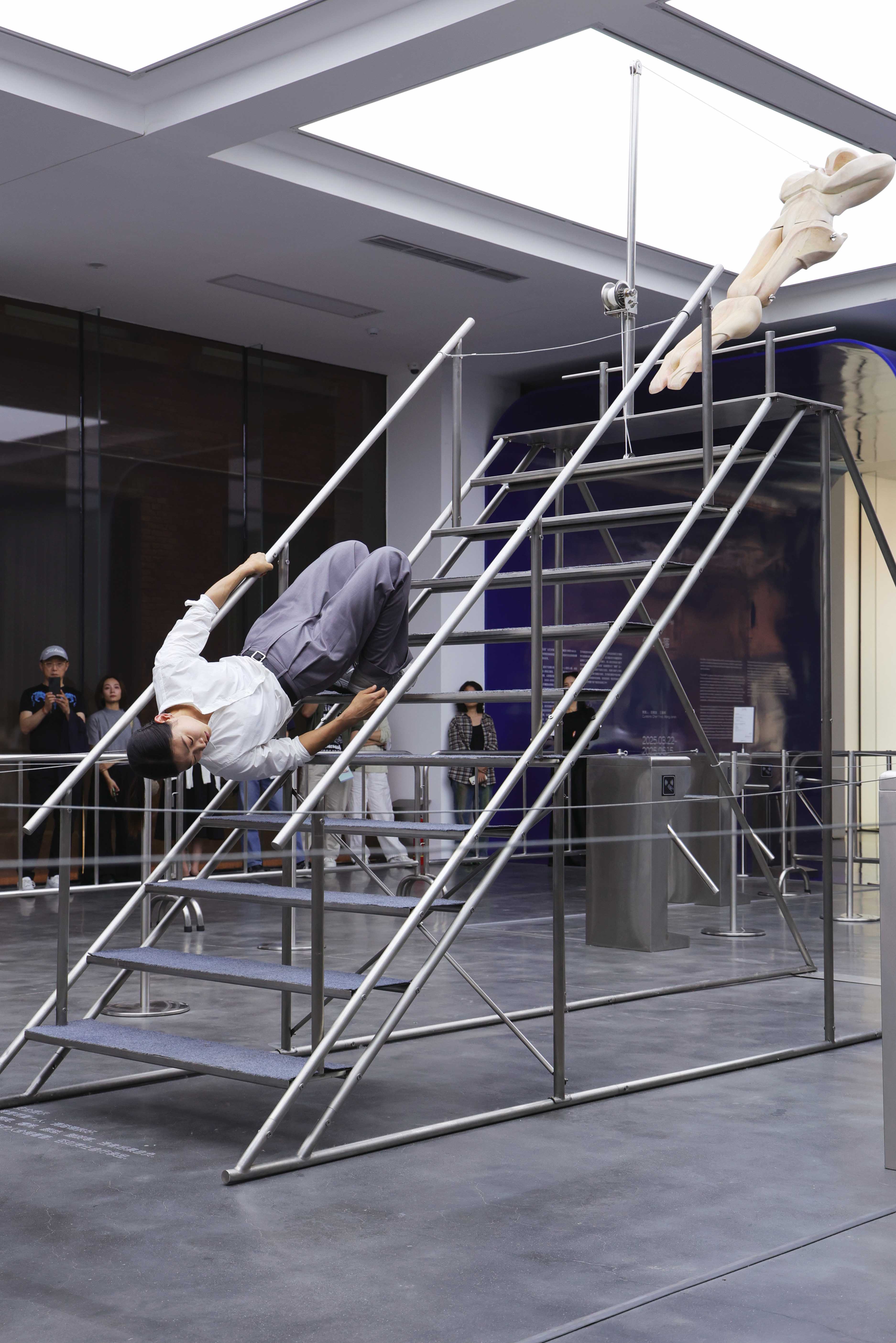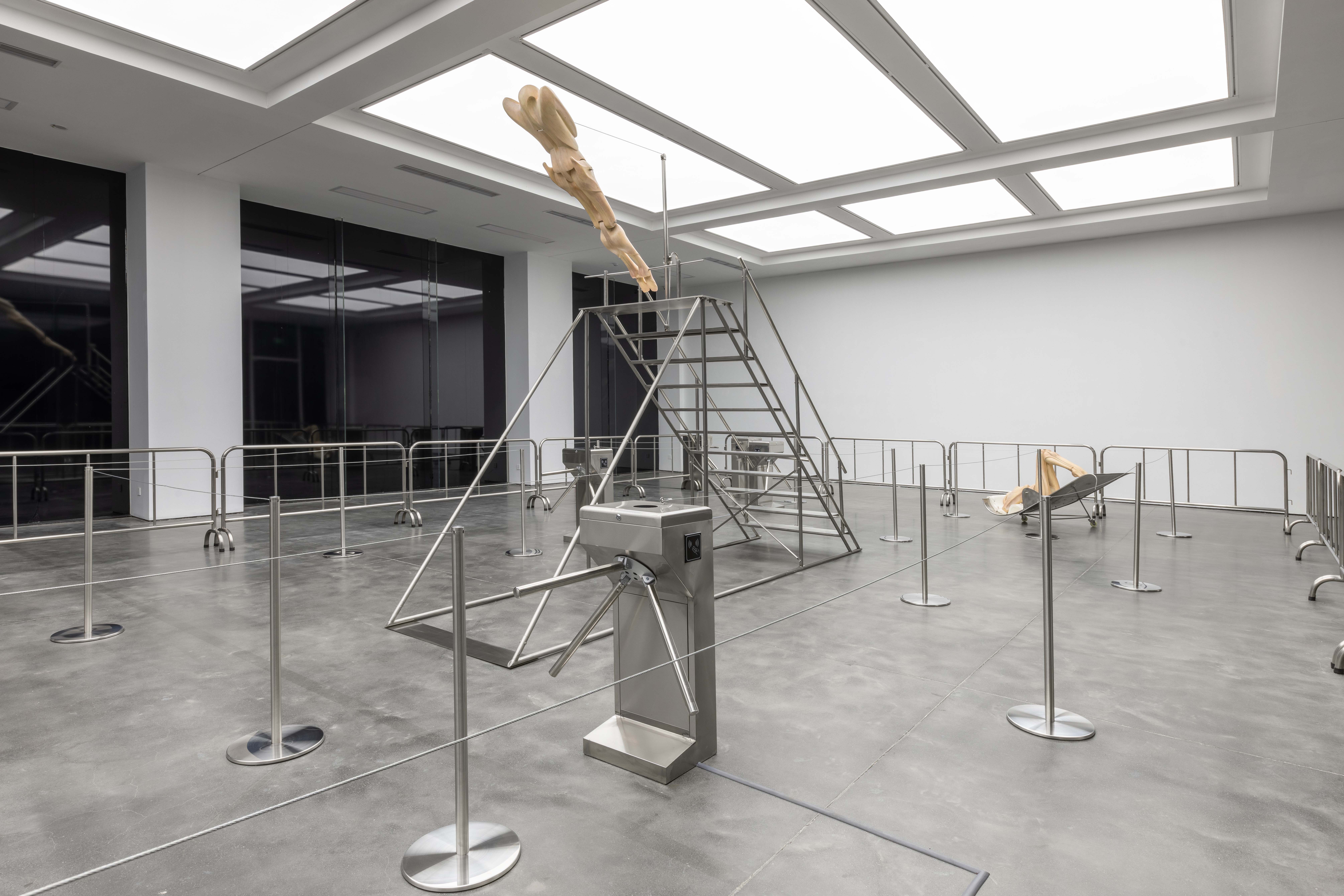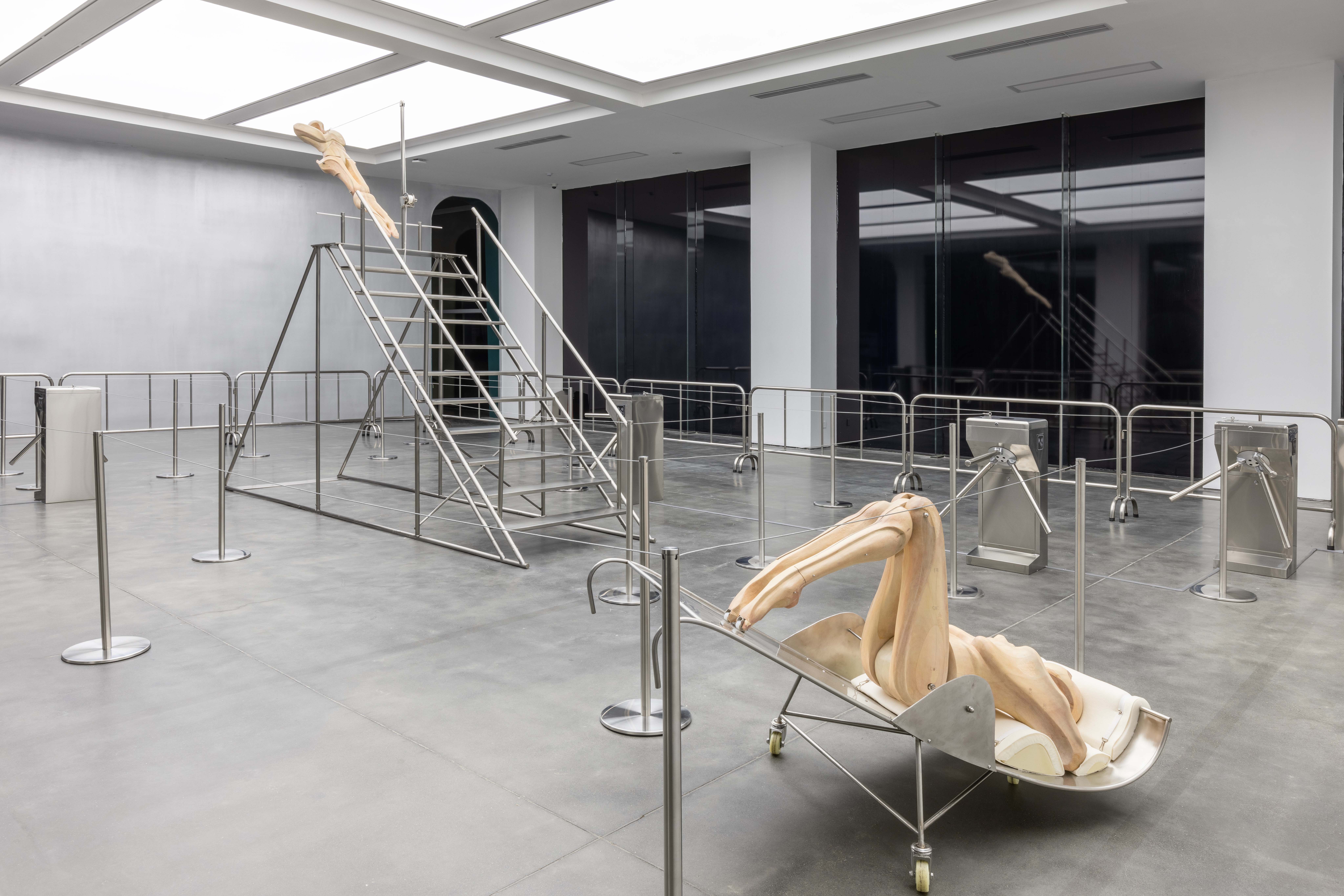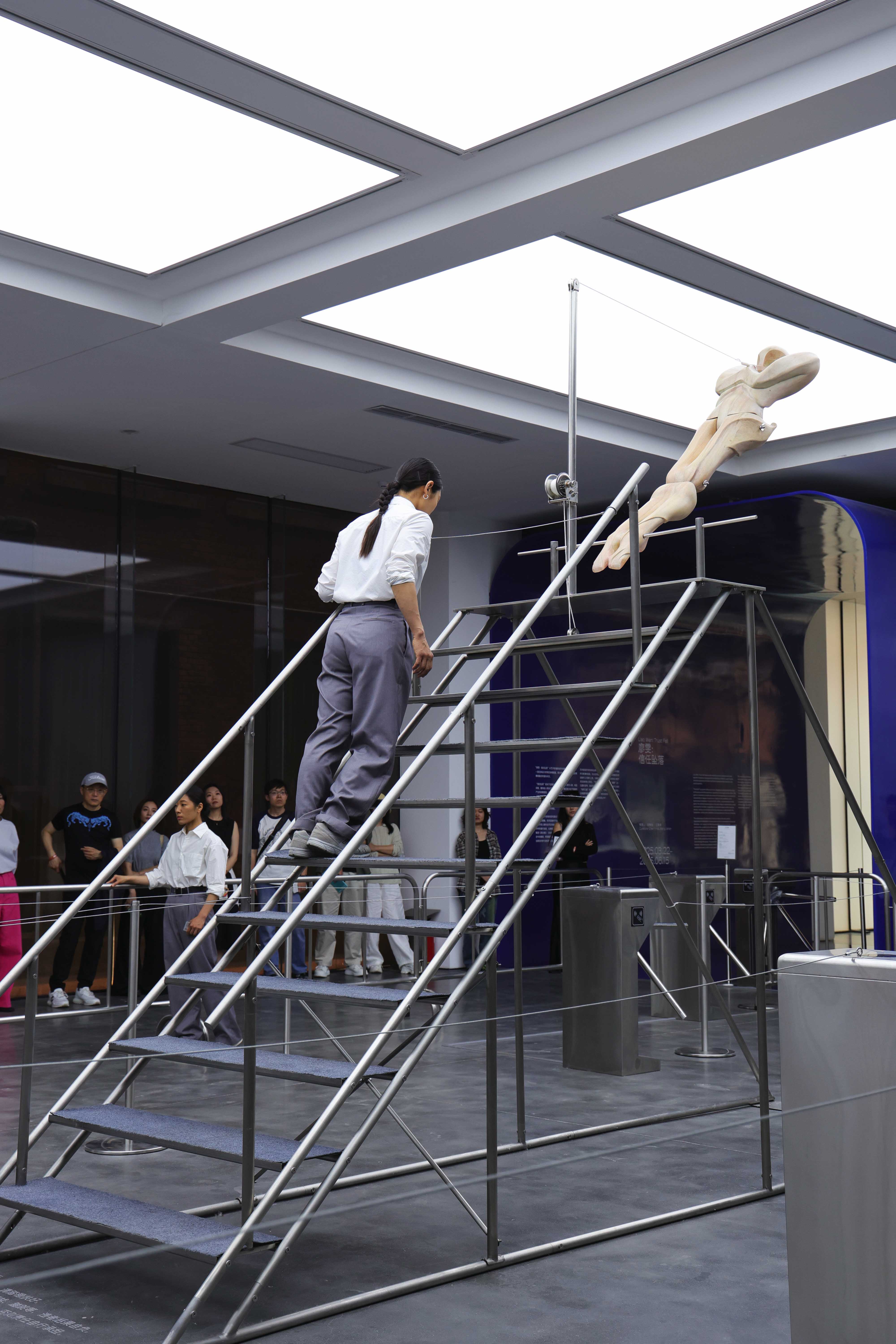 "Trust fall" is a game of fear and trust. One person stands with their back to the group and falls backward, expecting to be caught by the others. The game is intended to amplify the sense of interdependence in moments of vulnerability to deepen mutual trust. Central to the exhibition is the eponymous installation Trust Fall (2023–2025), a representation of this game: the inclined human figure on the steel stage is restrained by a rope connected to its chest, suspended in a delicate balance within intense tension. Visitors are invited to climb the staircase or walk beneath the installation, shifting their identities and experiences in the act of moving.