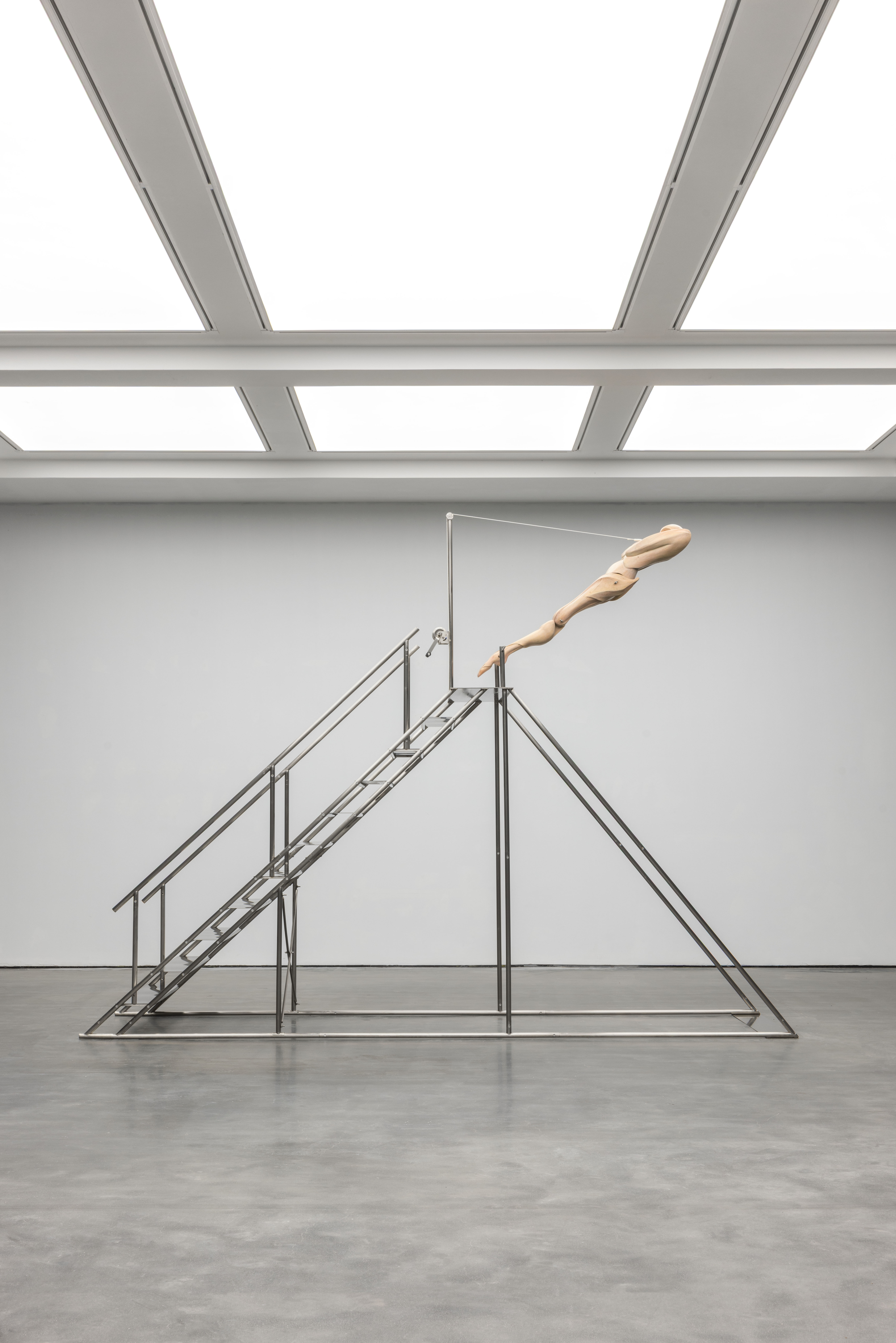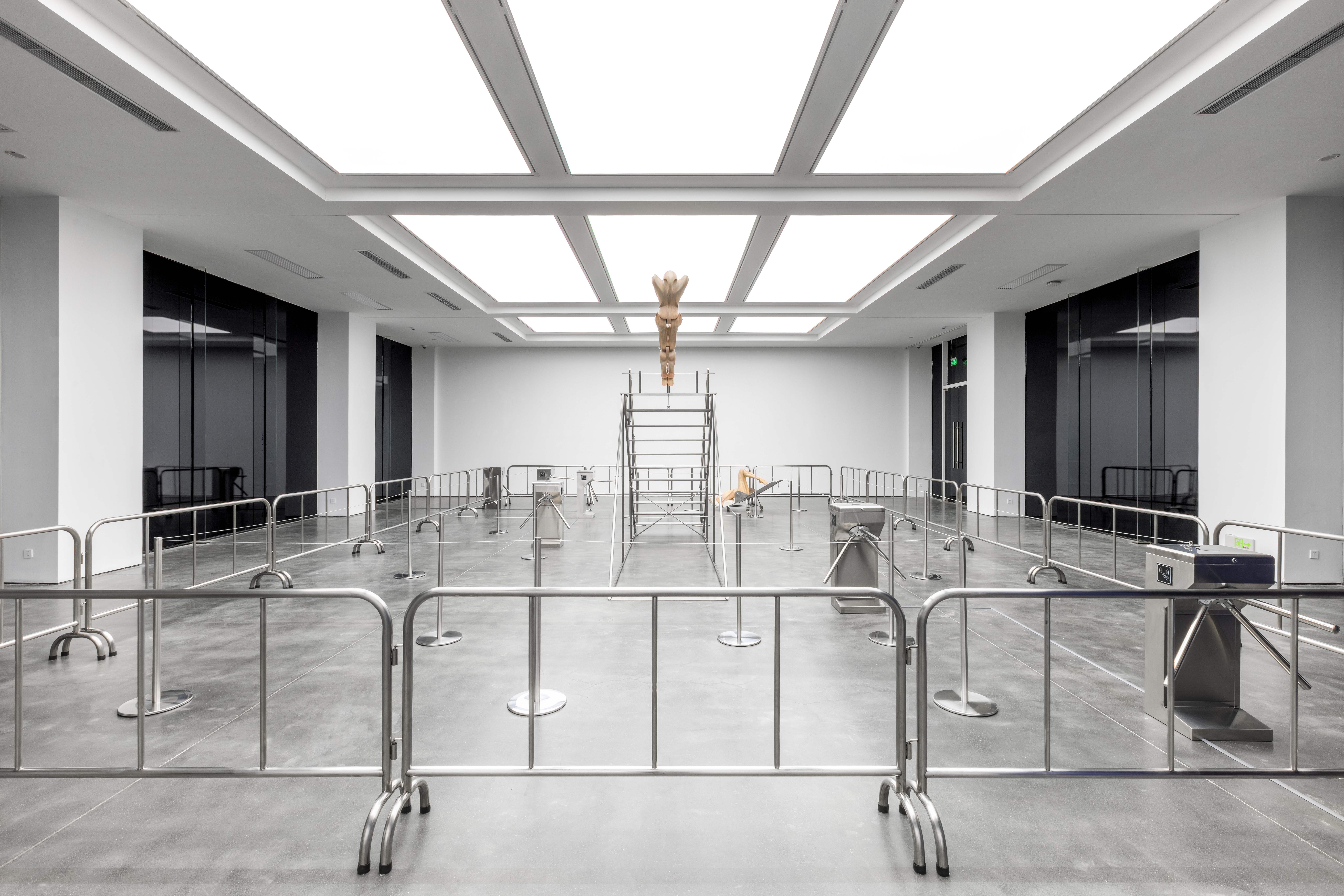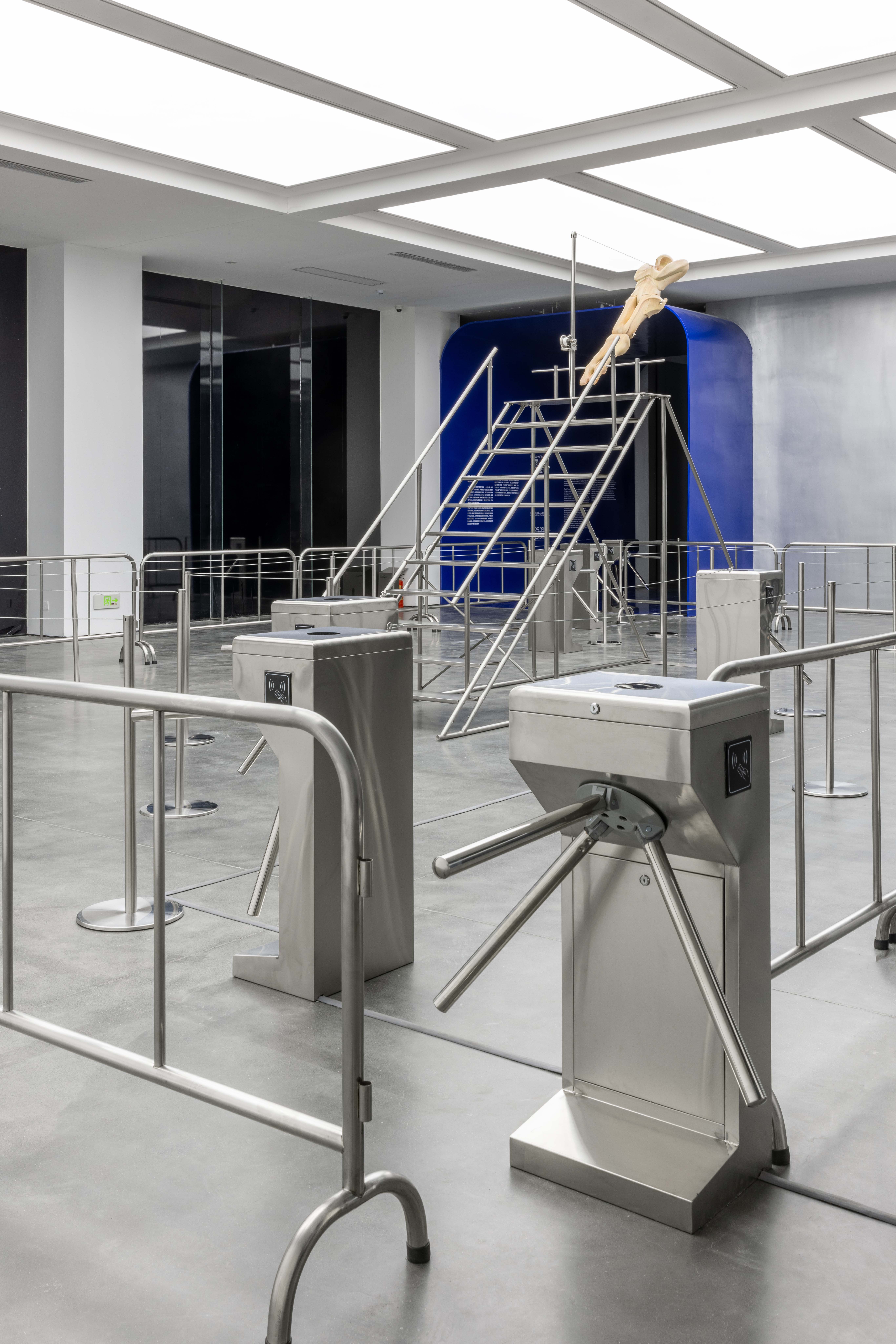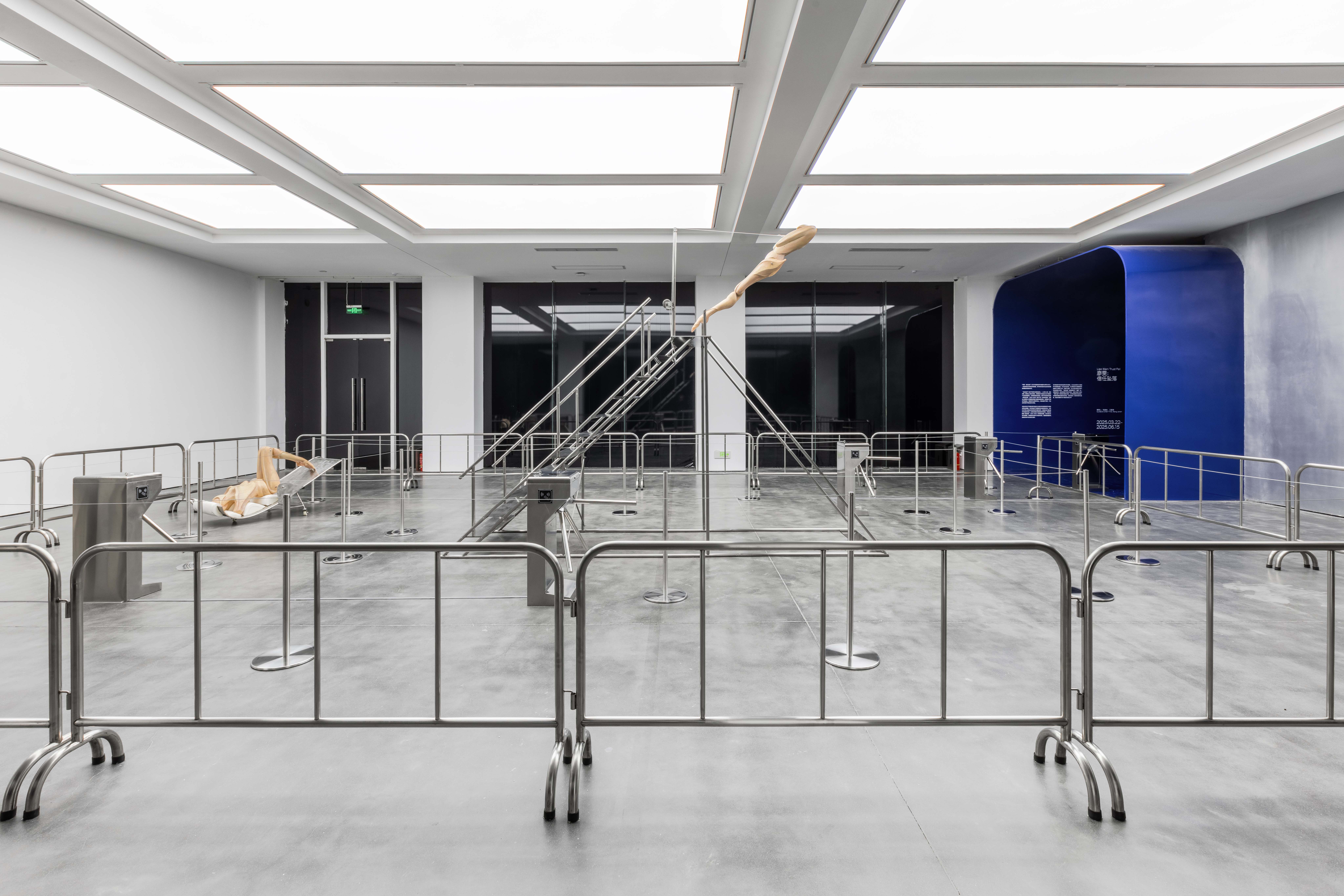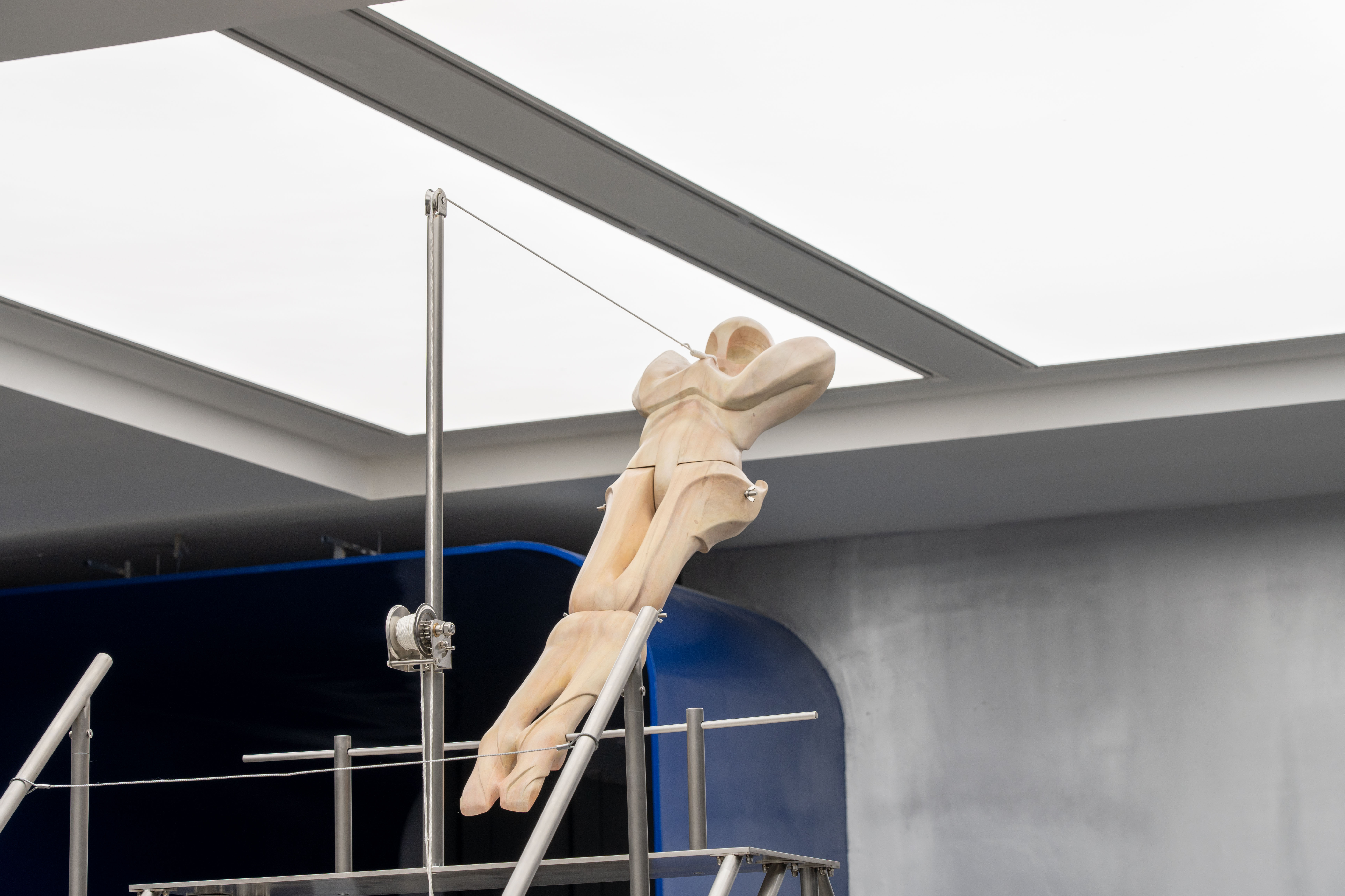 "Trust fall" is a game of fear and trust. One person stands with their back to the group and falls backward, expecting to be caught by the others. The game is intended to amplify the sense of interdependence in moments of vulnerability to deepen mutual trust. Central to the exhibition is the eponymous installation Trust Fall (2023–2025), a representation of this game: the inclined human figure on the steel stage is restrained by a rope connected to its chest, suspended in a delicate balance within intense tension. Visitors are invited to climb the staircase or walk beneath the installation, shifting their identities and experiences in the act of moving.