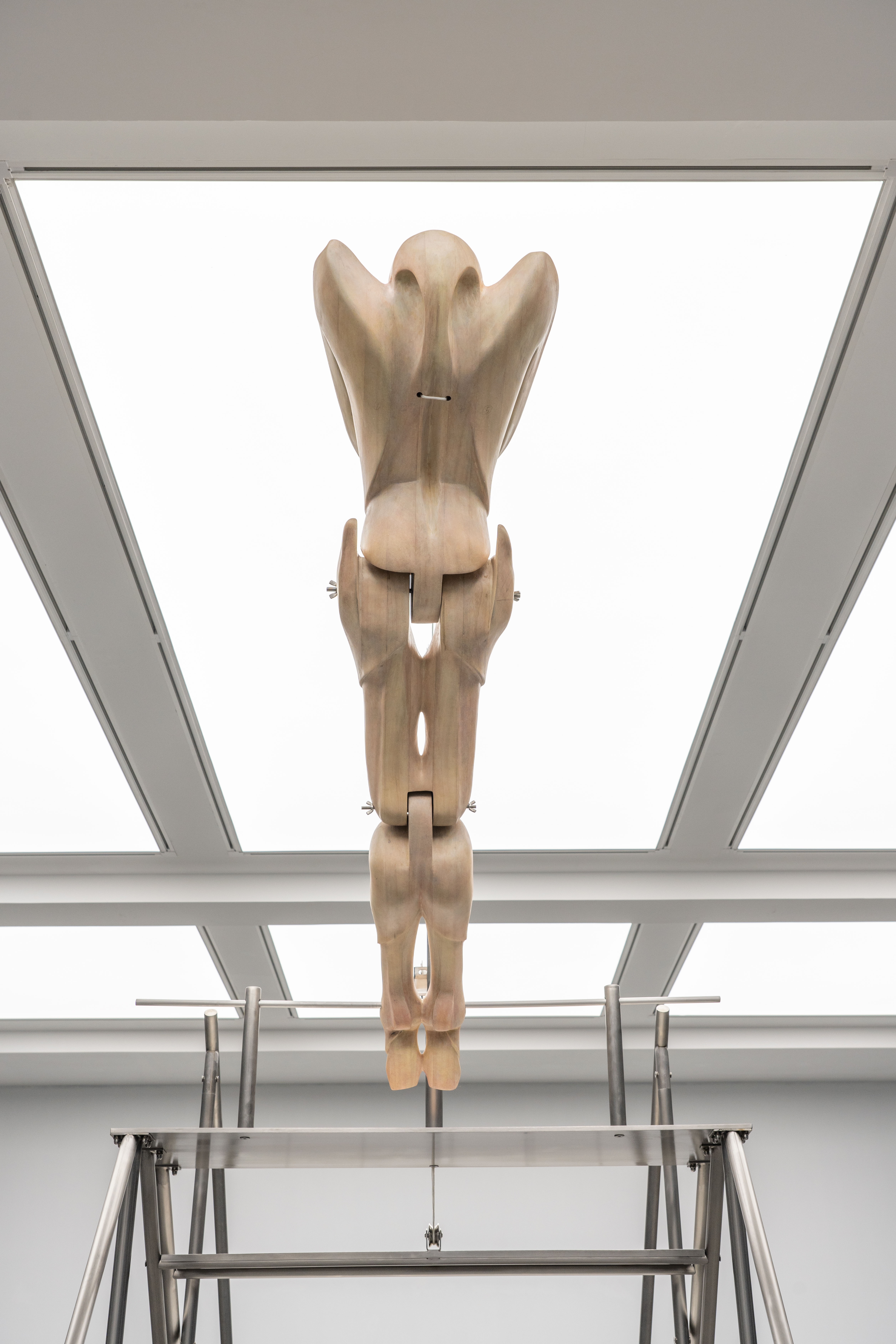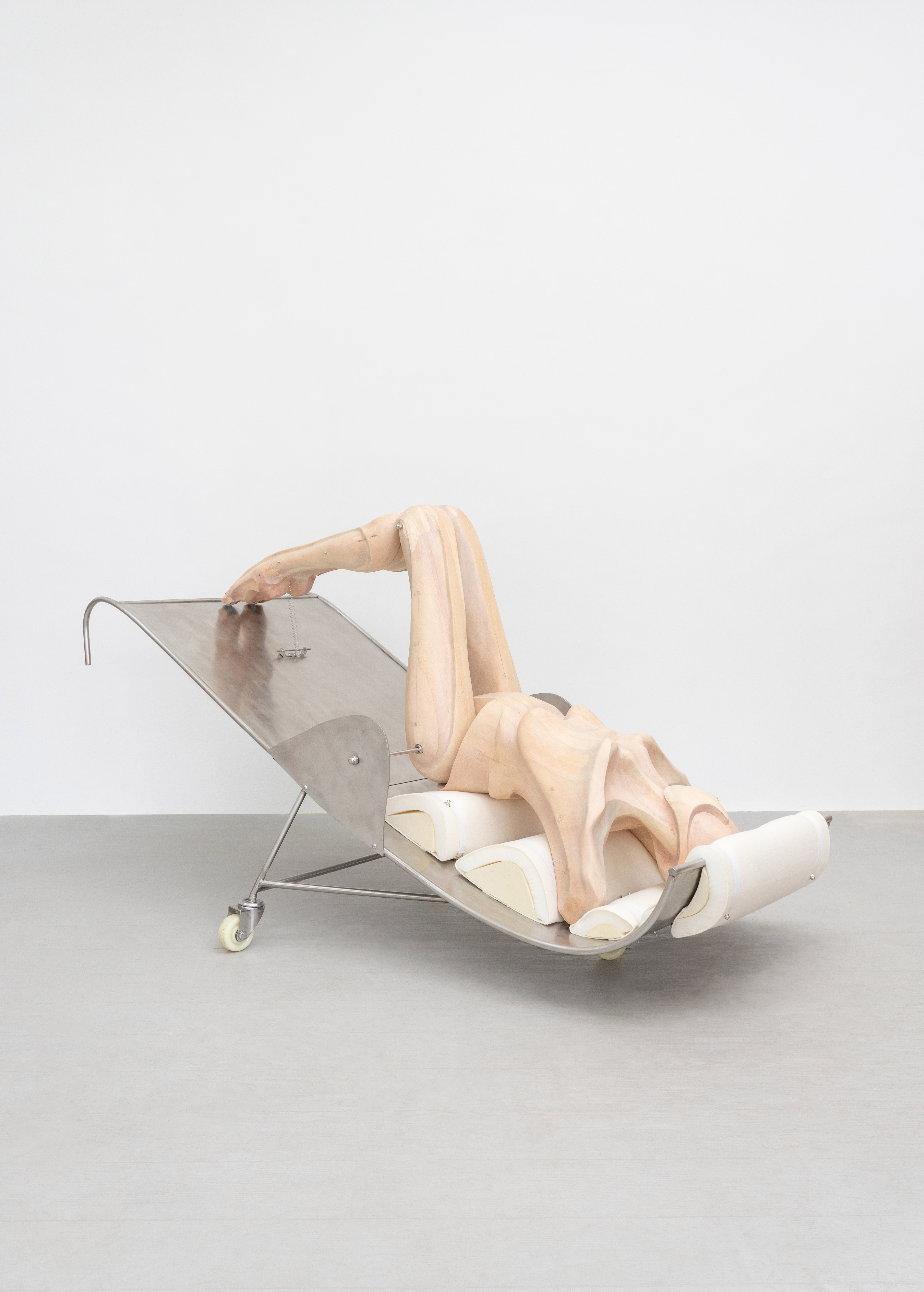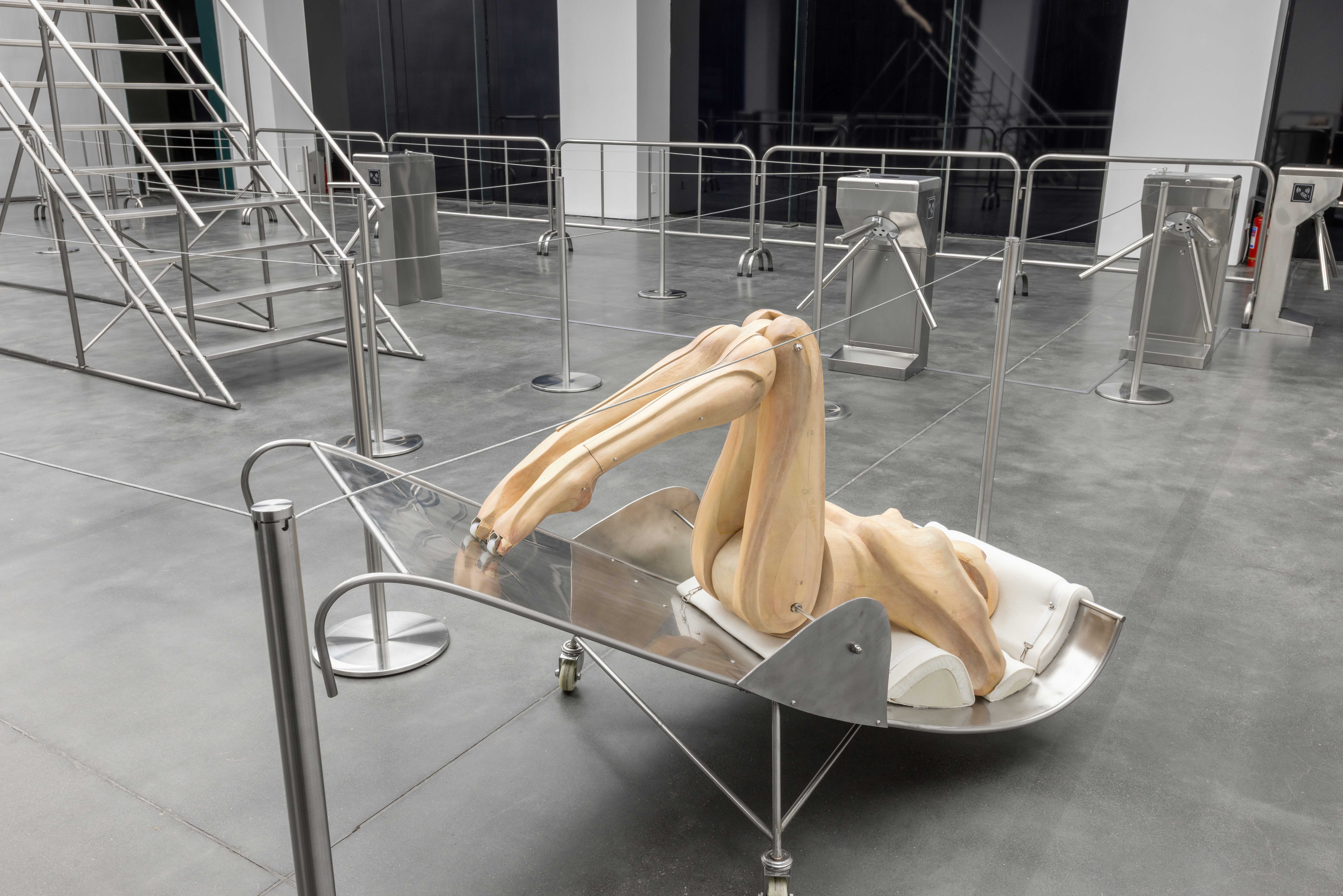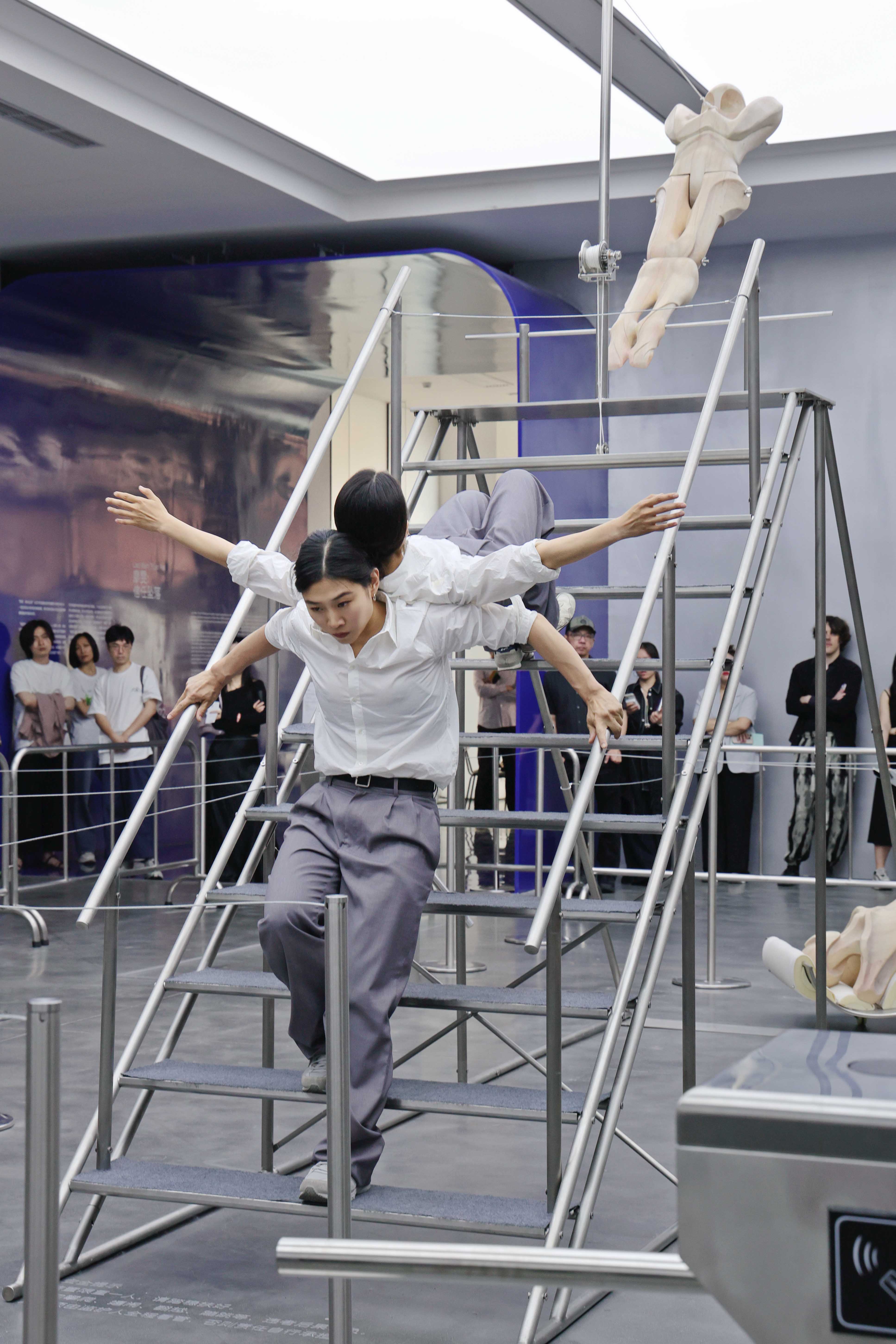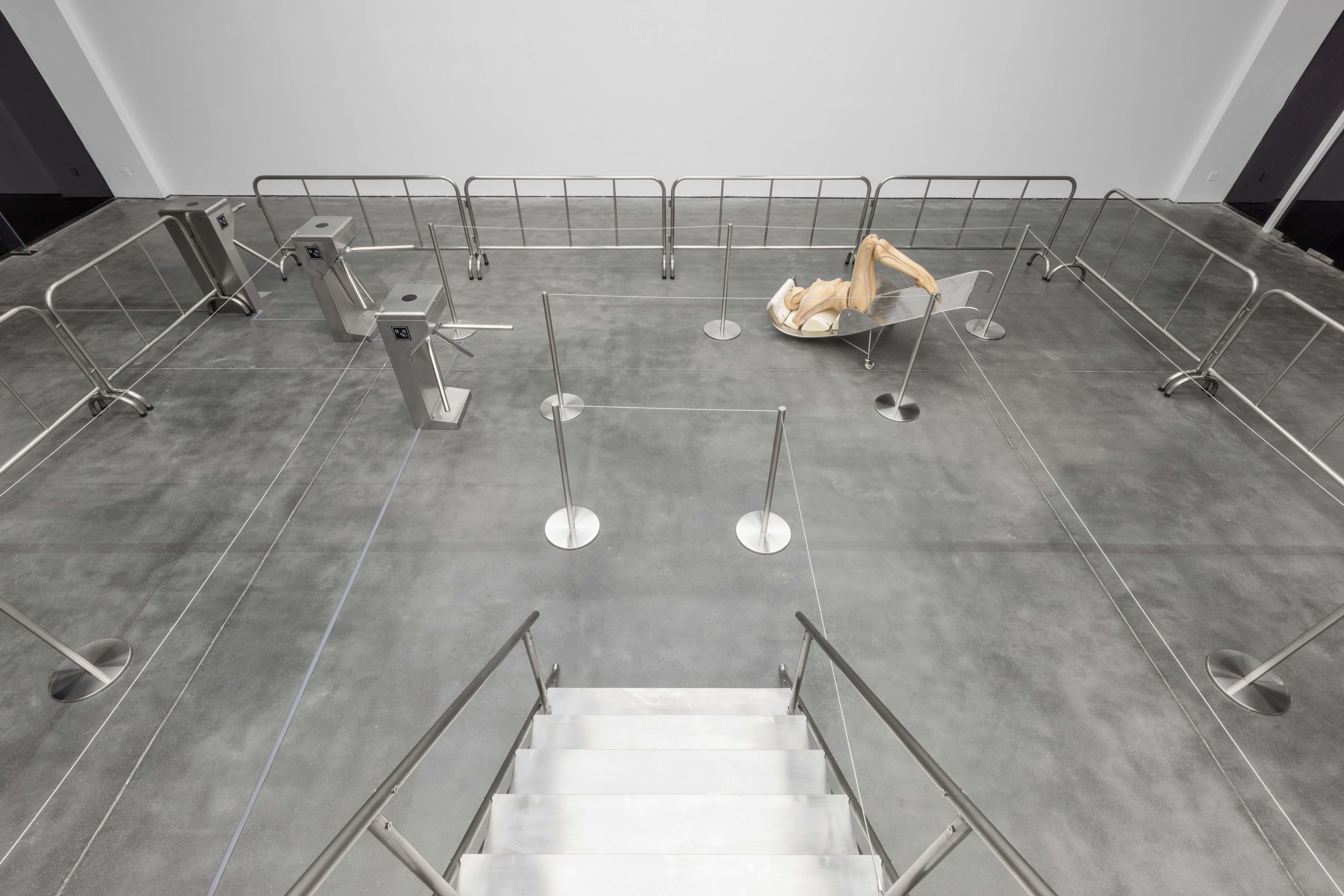 "Trust fall" is a game of fear and trust. One person stands with their back to the group and falls backward, expecting to be caught by the others. The game is intended to amplify the sense of interdependence in moments of vulnerability to deepen mutual trust. Central to the exhibition is the eponymous installation Trust Fall (2023–2025), a representation of this game: the inclined human figure on the steel stage is restrained by a rope connected to its chest, suspended in a delicate balance within intense tension. Visitors are invited to climb the staircase or walk beneath the installation, shifting their identities and experiences in the act of moving.