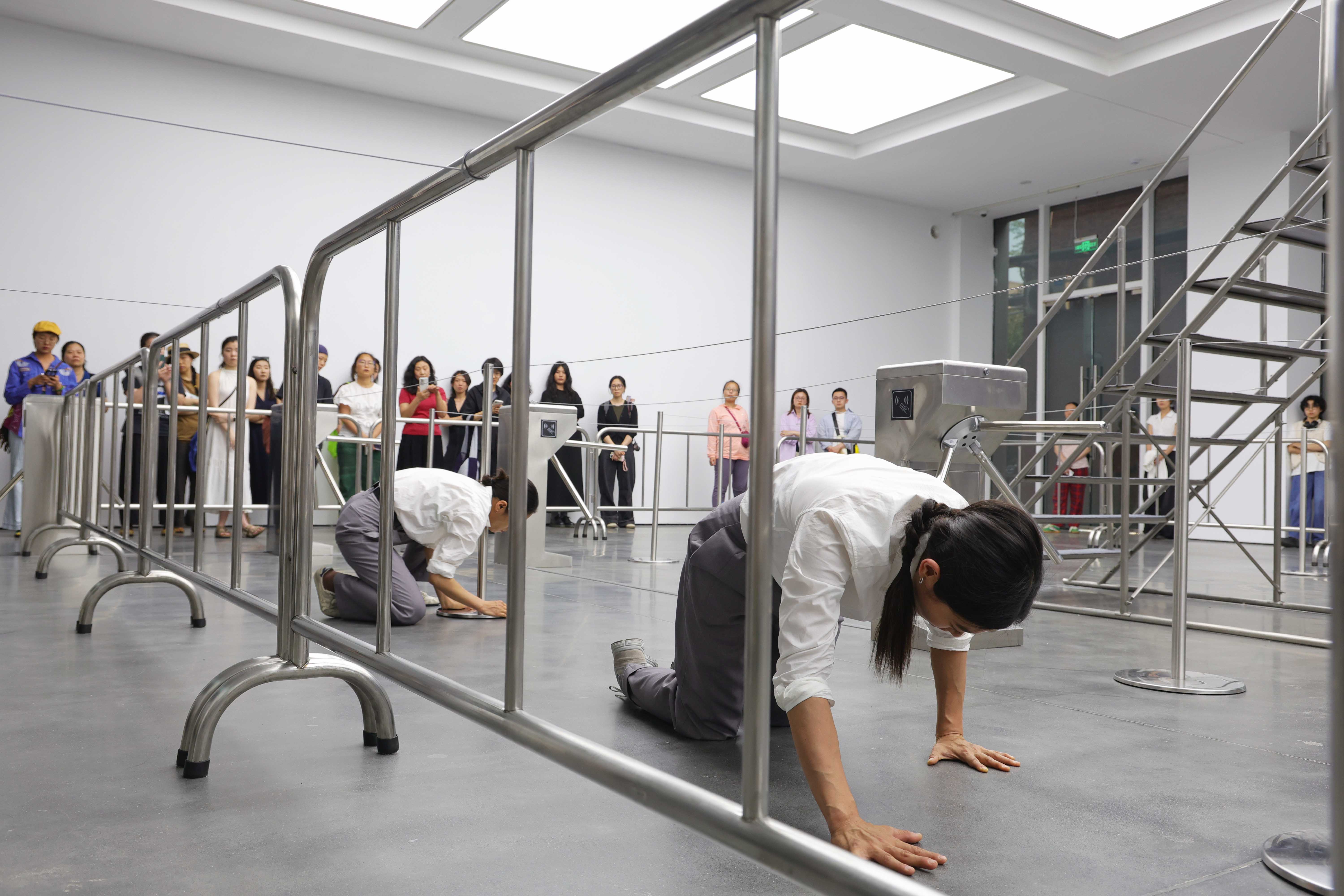 The exploration of insecurity in the work stems from the artist's experience of relocation in recent years and her contemplation of social alienation, her concern for the living conditions of marginalized communities, as well as her reflections on the intersection of living spheres of different social communities. The exhibition space is designed to resemble an urban transit system, constructing specific temporary rules with turnstiles and barriers. The interactive sculpture Wanderer (2024–2025) sometimes blocks the path, acting as an obstacle as visitors move through the space. The possibility of detaching from the system, however, remains ever-present; whether to adhere to or transgress the established order is left for each participant to explore and decide.